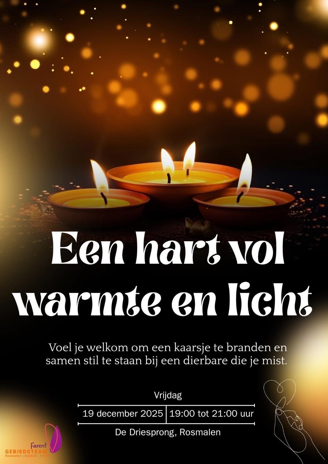 Van 19:00 tot 21:00 uur maken we midden in het centrum van De Driesprong samen een groot hart van kaarsjes. Een plek om even stil te staan bij wie belangrijk voor je is, om te herdenken of gewoon om samen te zijn.